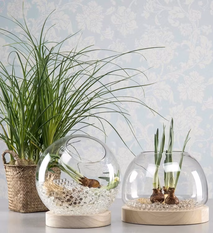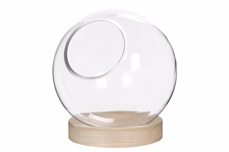 Glasklot lykta/vas/kruka, sned Produkten är tyvärr slut i lager. Leverantör: A Lot Decoration Glasklot som kan användas som lykta, vas eller kruka med kupad fot i ljust trä. Med vattenpärlor kan man göra ett fint blomsterarrangemang med färska blommor. Storlek: 25x25 cm.