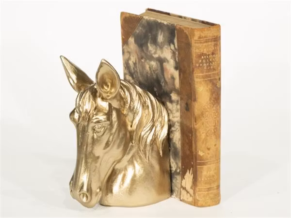 Stiligt bokstöd i form av ett hästhuvud, guldfärgat. Kan även användas som fristående prydnad.