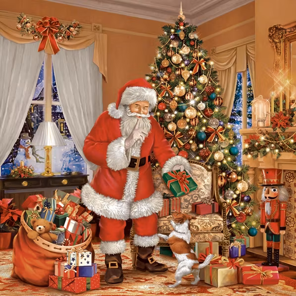 Lunchservett i bra kvalitet från Inicio med härligt julmotiv med tomten som kommer och lämnar julklappar. Fin, präglad bårdkant.