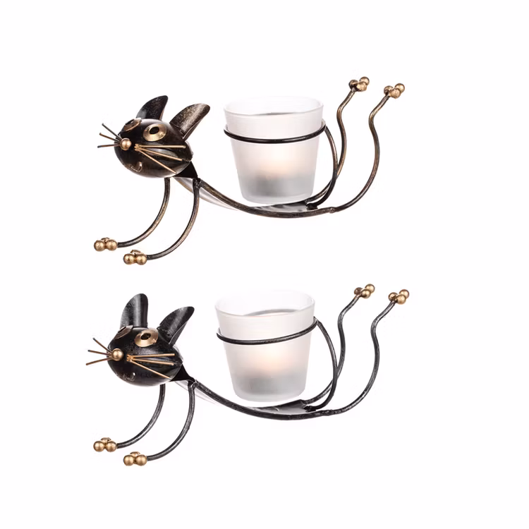 Kul ljuslykta i hamrad plåt i form av en katt som utövar yoga. Gulmetalldetaljer. Frostad glaslykta för värmeljus. Finns i två olika utföranden, svart eller brun.