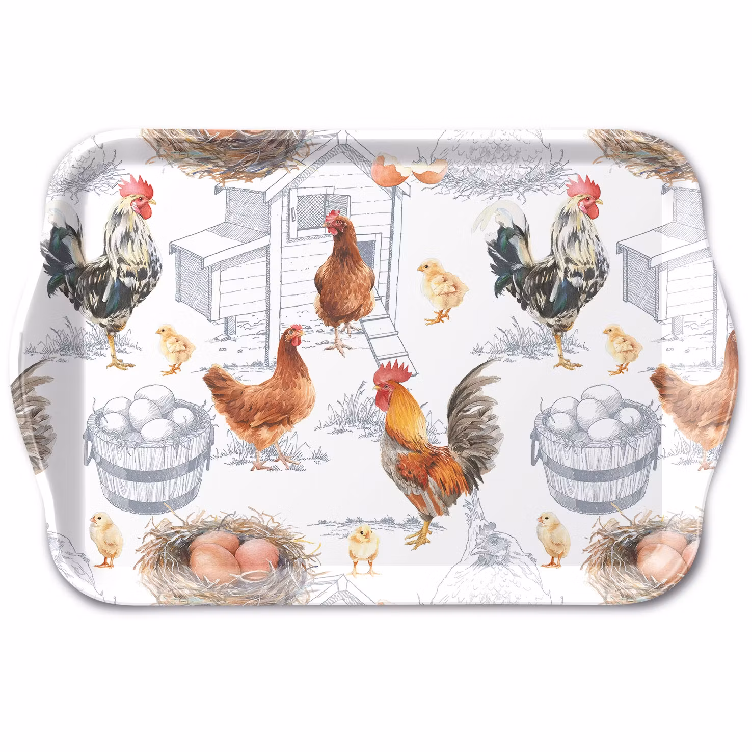 En behändig bricka med fint motiv från hönsgården med tuppen, hönorna och kycklingarna och en massa fina ägg. Denna bricka är idealisk som en liten frukostbricka, som ett litet uppläggningsfat eller för din eftermiddagsfika - perfekt för din kaffe-/tekopp och något tilltugg. Fint till påsk.