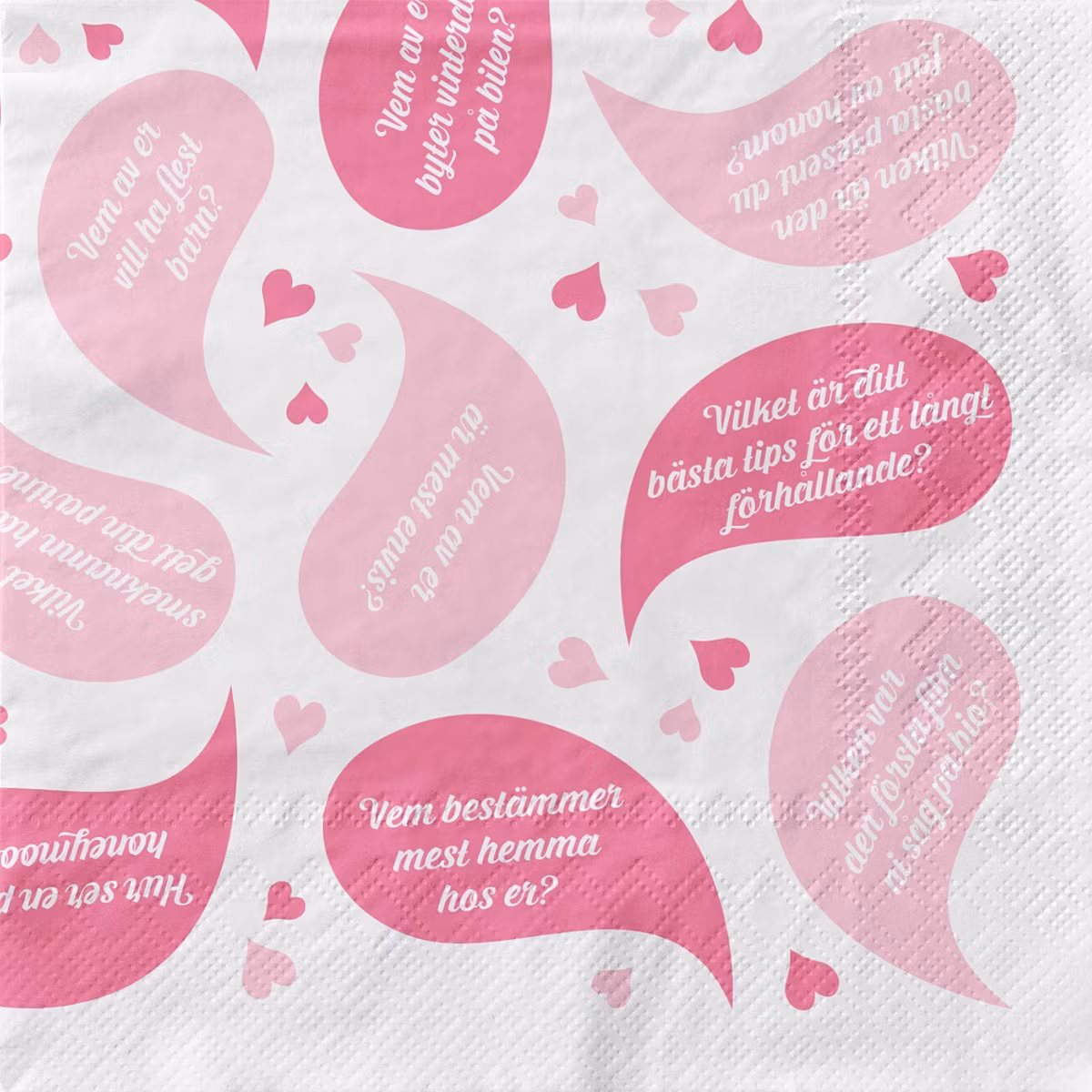Konversett är lika enkel som genial. En servett med ämnen och uppslag som lockar till samtal och konversation. Det är den självklara festhöjaren på möhippor och tjejfester.