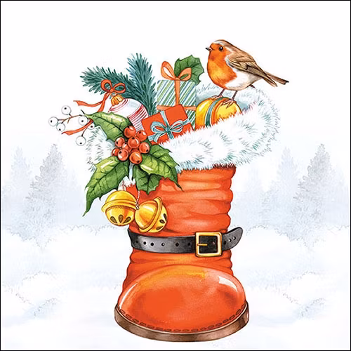 En fin julservett i bra kvalitet från Ambiente. Fint julmotiv med en rödhake som sitter bland julklappar och julpynt. Fin, präglad bårdkant. Innehåller 20 st servetter, 3 lager.