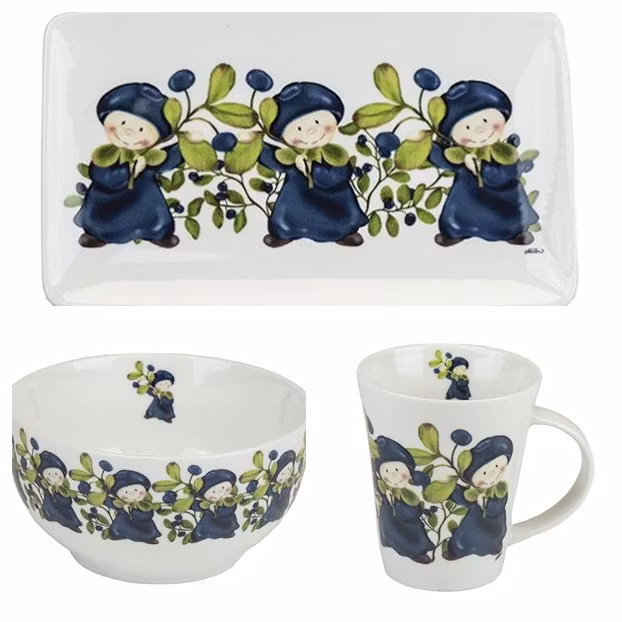 * Fin porslinsskål dekorerad med söta blåbärsbarn. Inuti varje skål finns ett litet blåbärsbarn med en blåbärskvist. Användbar till både frukost och snacks på kvällen. Rymmer 4 dl. Storlek: 13 x 7 cm