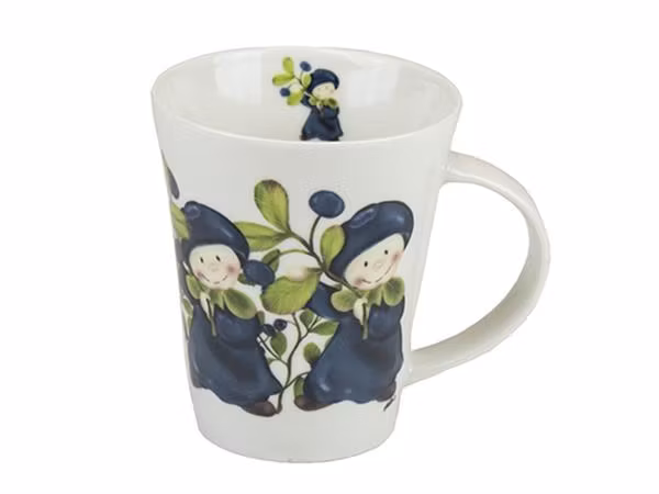 * Snygg, rejäl mugg i porslin med fint motiv med söta blåbärsbarn. Inuti muggen ett litet motiv med ett blåbärsbarn med en blåbärskvist.